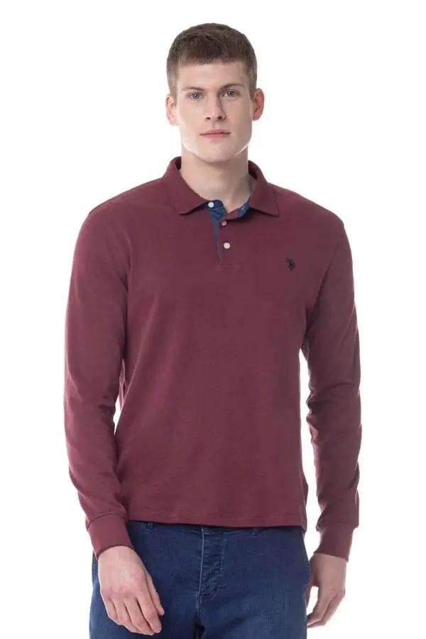 Polo Manches Longues Contraste Chambray + Coudieres Rouge Fonce