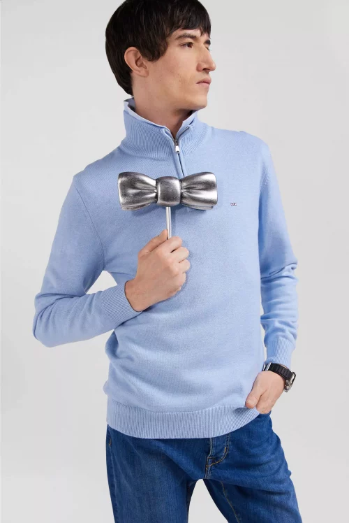 Pull Col Cheminee Laine & Coton 1/2 Zip Bleu Clair